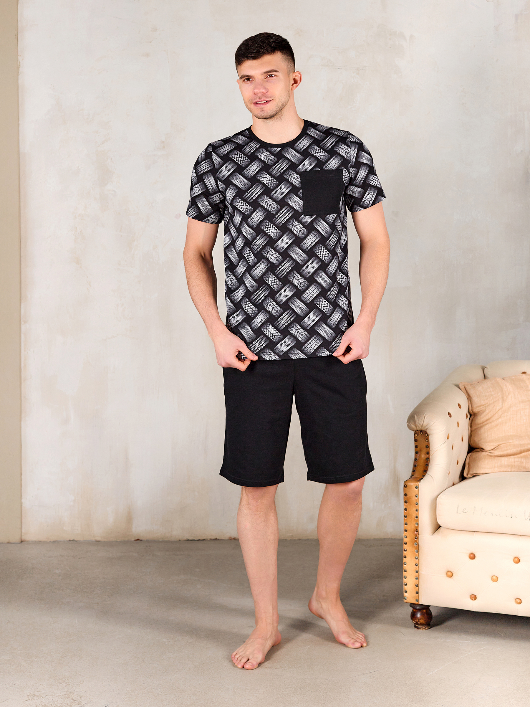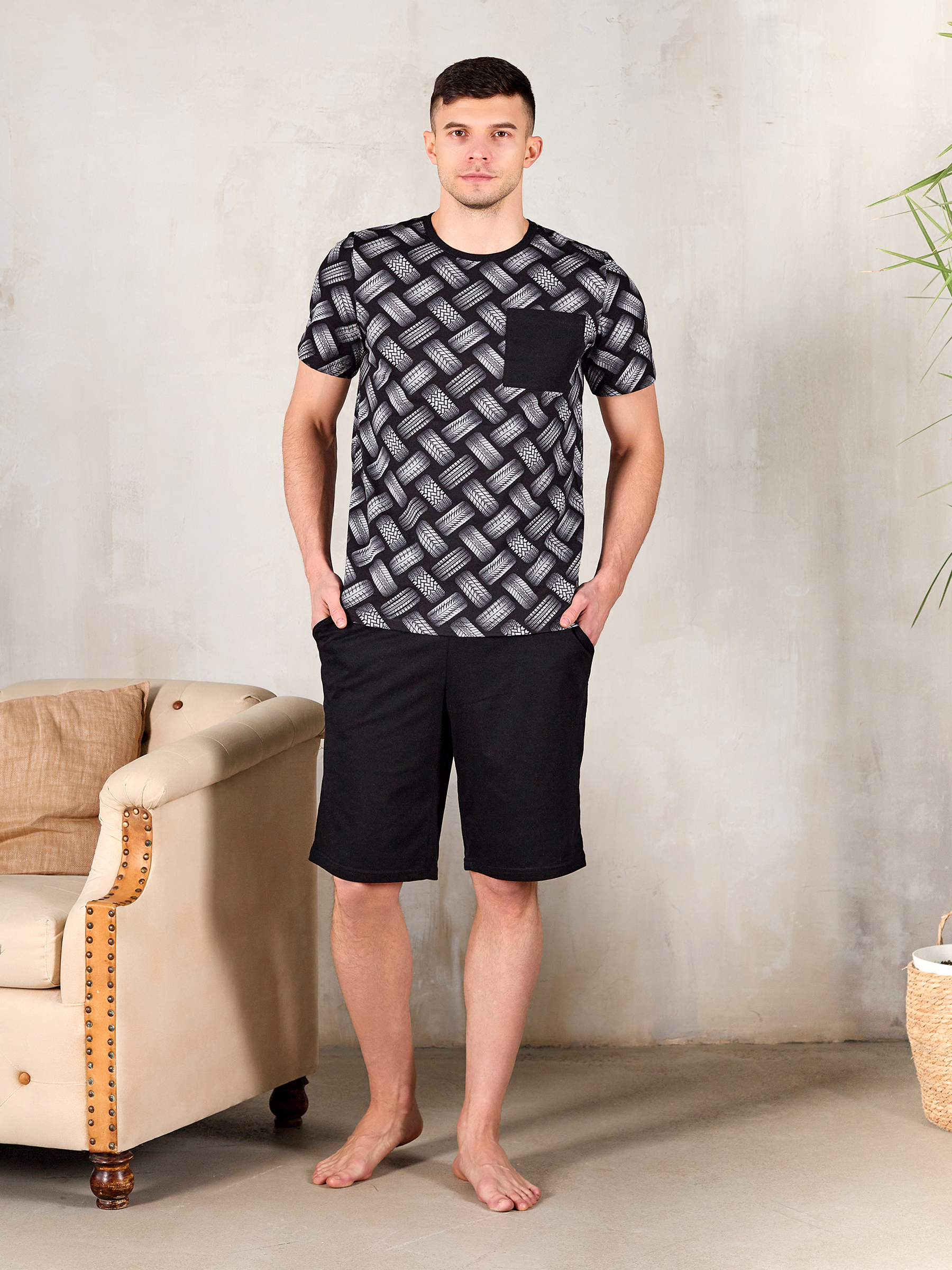 Комплект мужской для дома состоит и шорт домашних с вместительными карманами, в которые удобно положить телефон, деньги, ключи и т.д, пояс на широкой резинке, которая хорошо зафиксирована, благодаря этому не перекручивается внутри и футболки с короткими втачными рукавами и накладным карманом на груди горловина округлая.